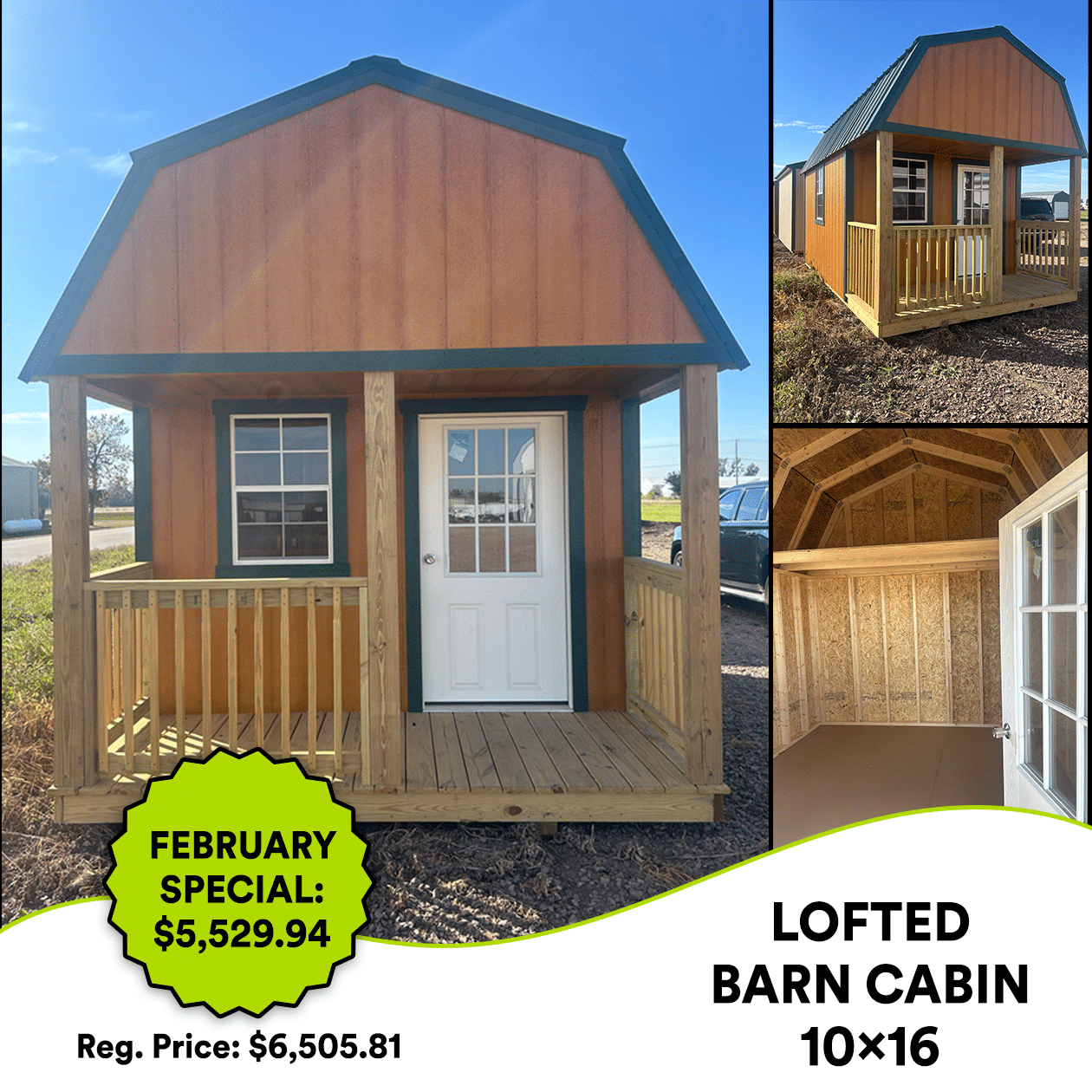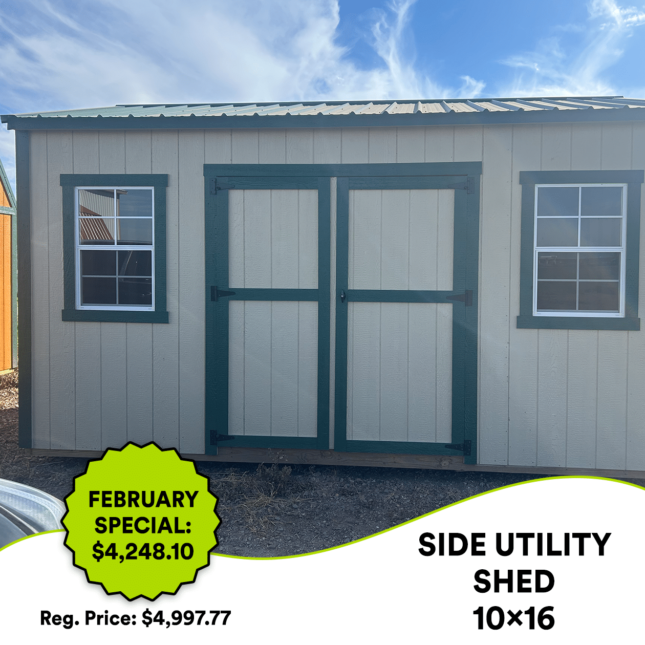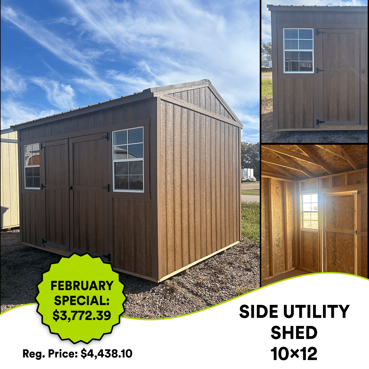 All Sheds come with a 30 year metal roof. Colored Urethane LP SmartBoard siding is standard. Metal siding is available.